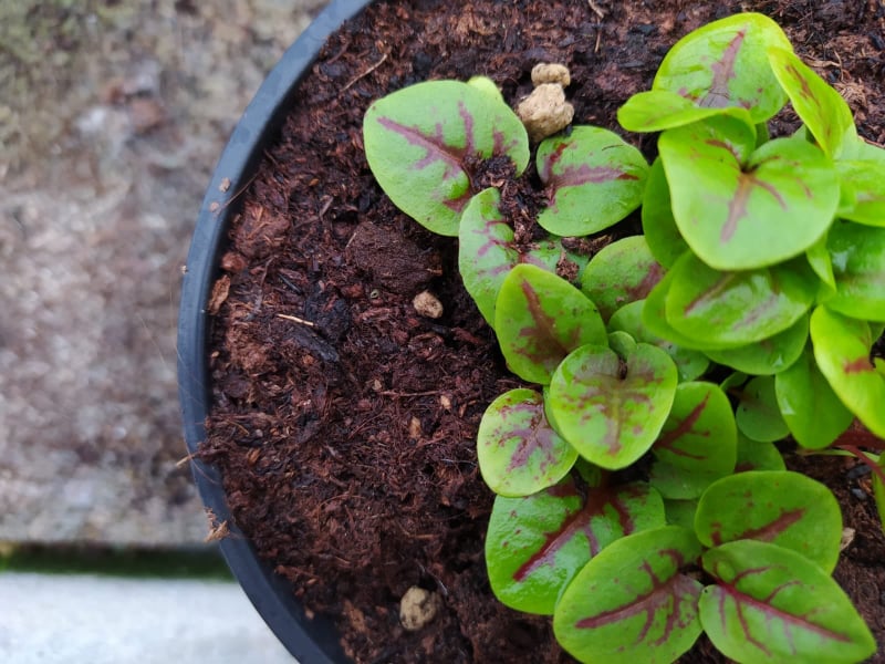 Le feuillage lancéolé et veiné de rouge se caractérise par sa saveur acide.