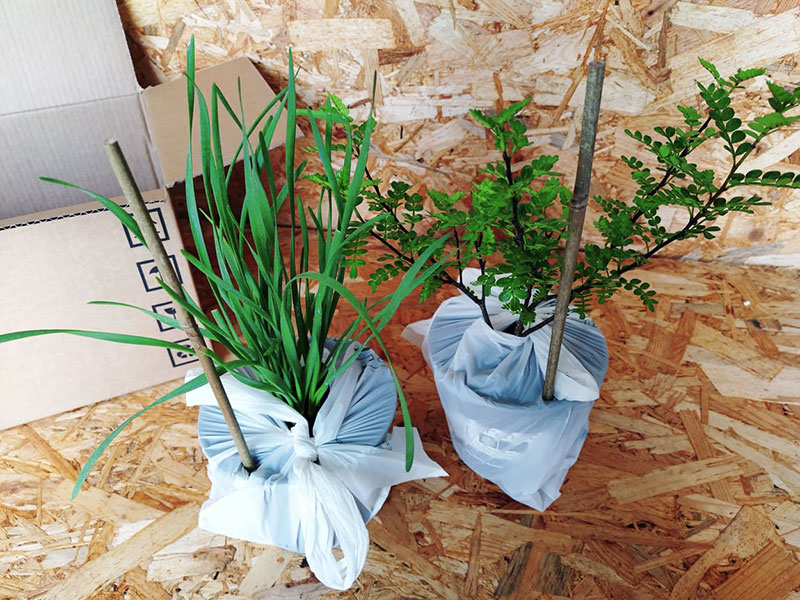 Il sacchetto, fissato attorno al vaso e al collo della pianta, impedisce la fuoriuscita del terriccio. Il tutore, la cui lunghezza viene adattata in base al verso di posizionamento delle piante, permette inoltre di stabilizzarne la posizione, evitando spostamenti che potrebbero essere causati da urti e/o vibrazioni nel trasporto.