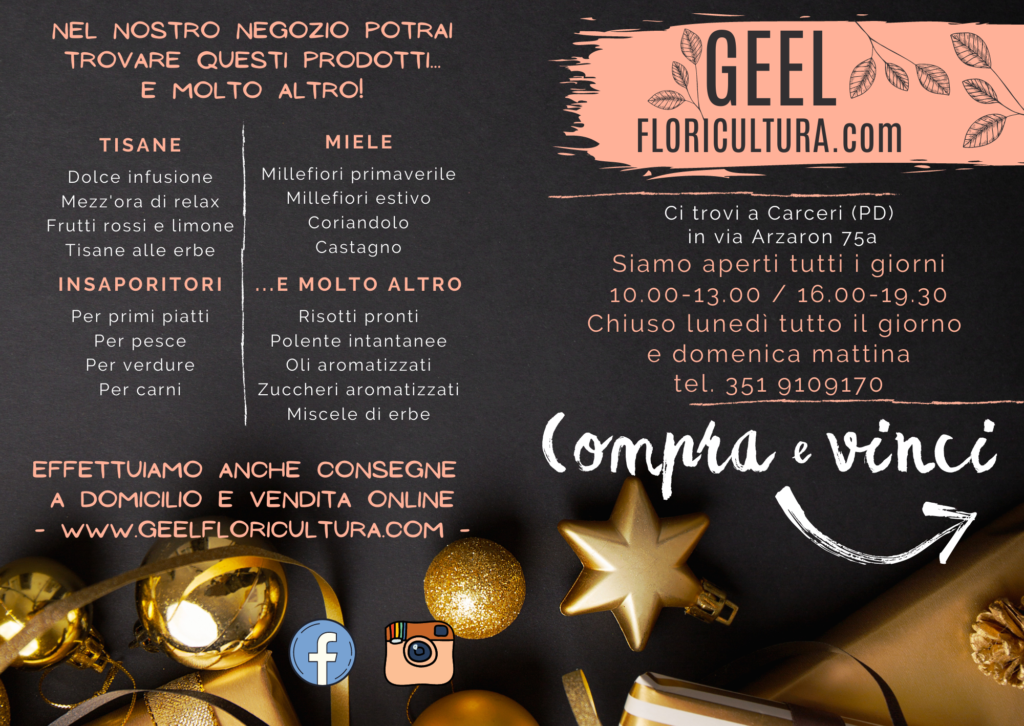 MODALITA’ DI PARTECIPAZIONE: Dal giorno 01/12/2020 al giorno 05/01/2021 sarà possibile per tutti i consumatori acquistare i nostri lavorati di erbe e il nostro miele fisicamente presso il nostro negozio in via Arzaron, 75/a, 35040 a Carceri (PD), presso i mercati settimanali di Lonigo (VI), Rovigo (RO), Noventa Vicentina (VI), Conselve (PD), Montagnana (PD), Cavarzere (VE), Legnago (VR), Zevio (VR) e Camisano Vicentino (VI), e online mediante il nostro e-commerce all’indirizzo www.geelfloricultura.com visionando la categoria https://www.geelfloricultura.com/categoria-prodotto/erbificio/